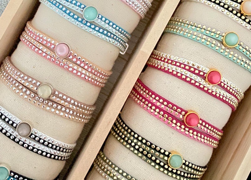 Deze superleuke wikkelarmbandjes zijn gemaakt van suéde koord met shiny studs en een cabochon steentje.